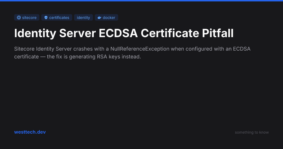 If your Sitecore Identity Server container is crashing at startup with a NullReferenceException and the JWKS endpoint returns a 500, check what type of key your development certificate was generated with. There’s a good chance it’s ECDSA, and Identity Server needs RSA.