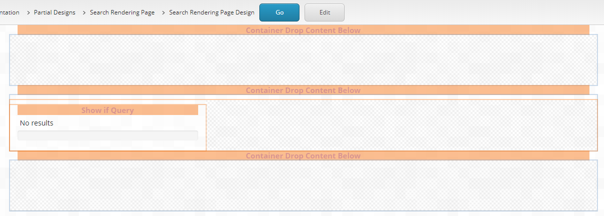 The Search Results component is currently hidden in the left column. Here’s how that looks in the Experience Editor. The component is part of a Partial Design, which explains why no other component is seen.