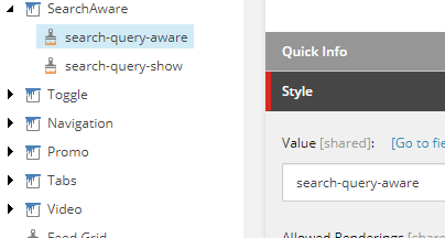 - The style “search-query-aware” tells the JavaScript that it should monitor components with the class whenever the query hash changes.