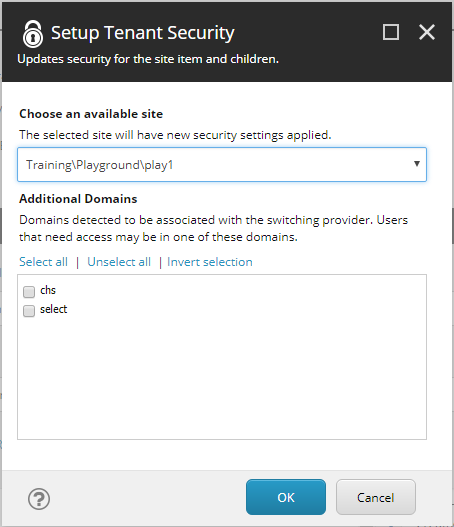 The dialog lists all of the available SXA tenants as well as any additional domains configured using the switching provider. This can be very helpful when using the Active Directory module because those users are not in the same domain as the tenant.